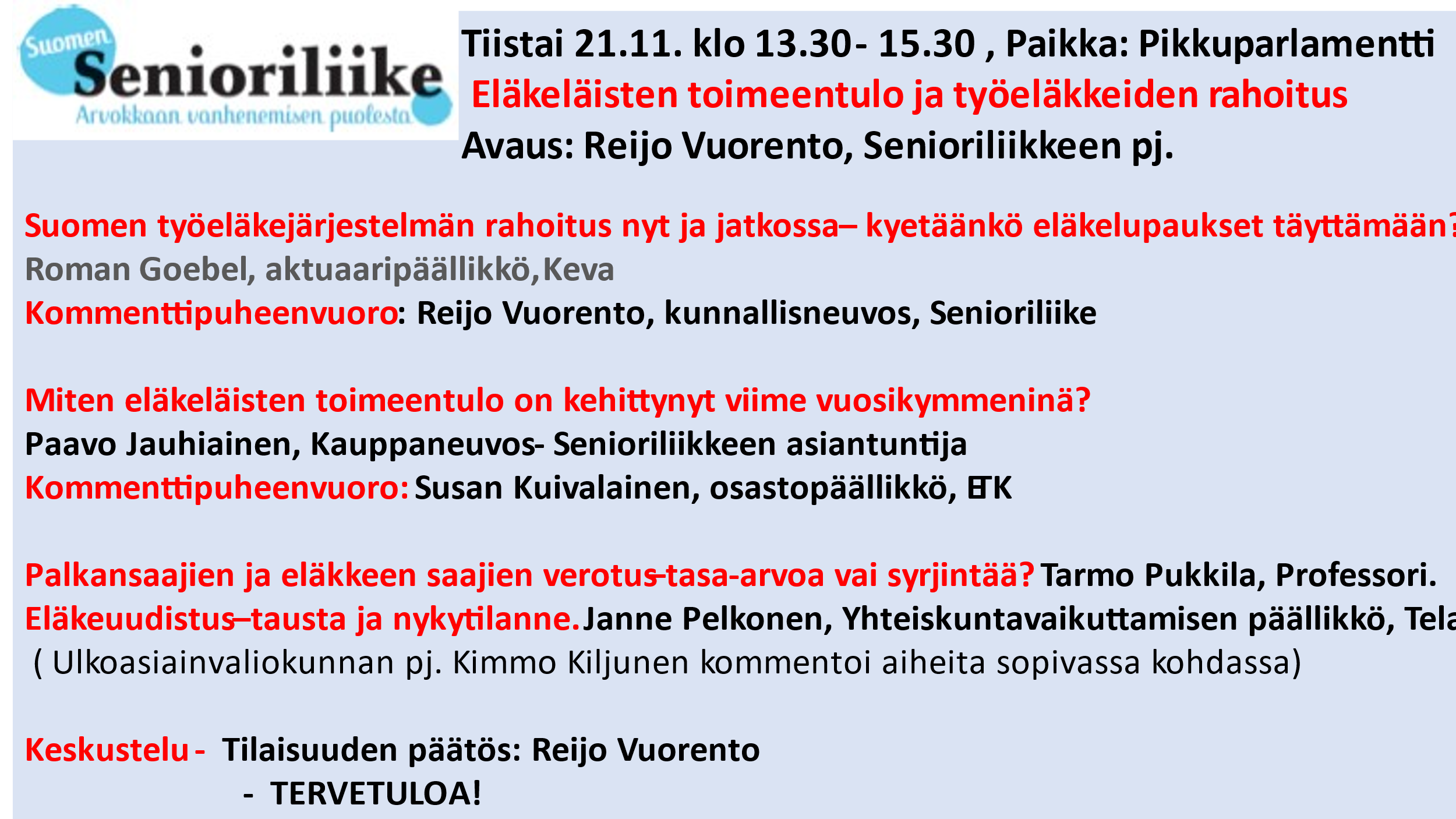 Suomen Senioriliike järjestää eläkeläisten toimeentuloa ja eläkejärjestelmän kestävyyttä koskevan tilaisuuden